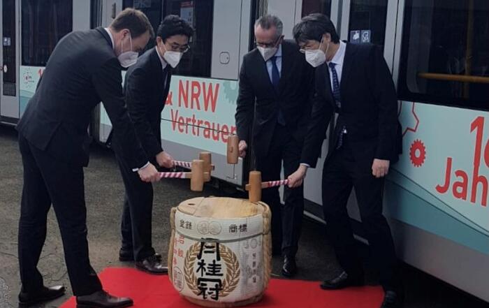 日独交流160周年、並びに2021年日本デイズ開催に際し、デュッセルドルフ日本商工会議所は、NRW州と日本との経済関係の歴史について、デュッセルドルフ市内を走るRheinbahn車両内で特別な展示を行いました。